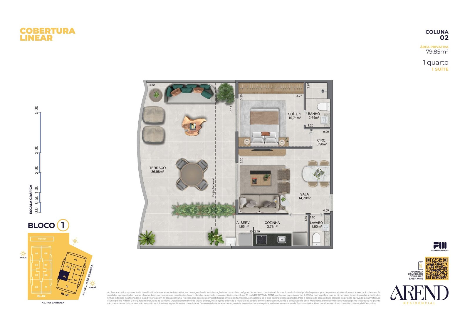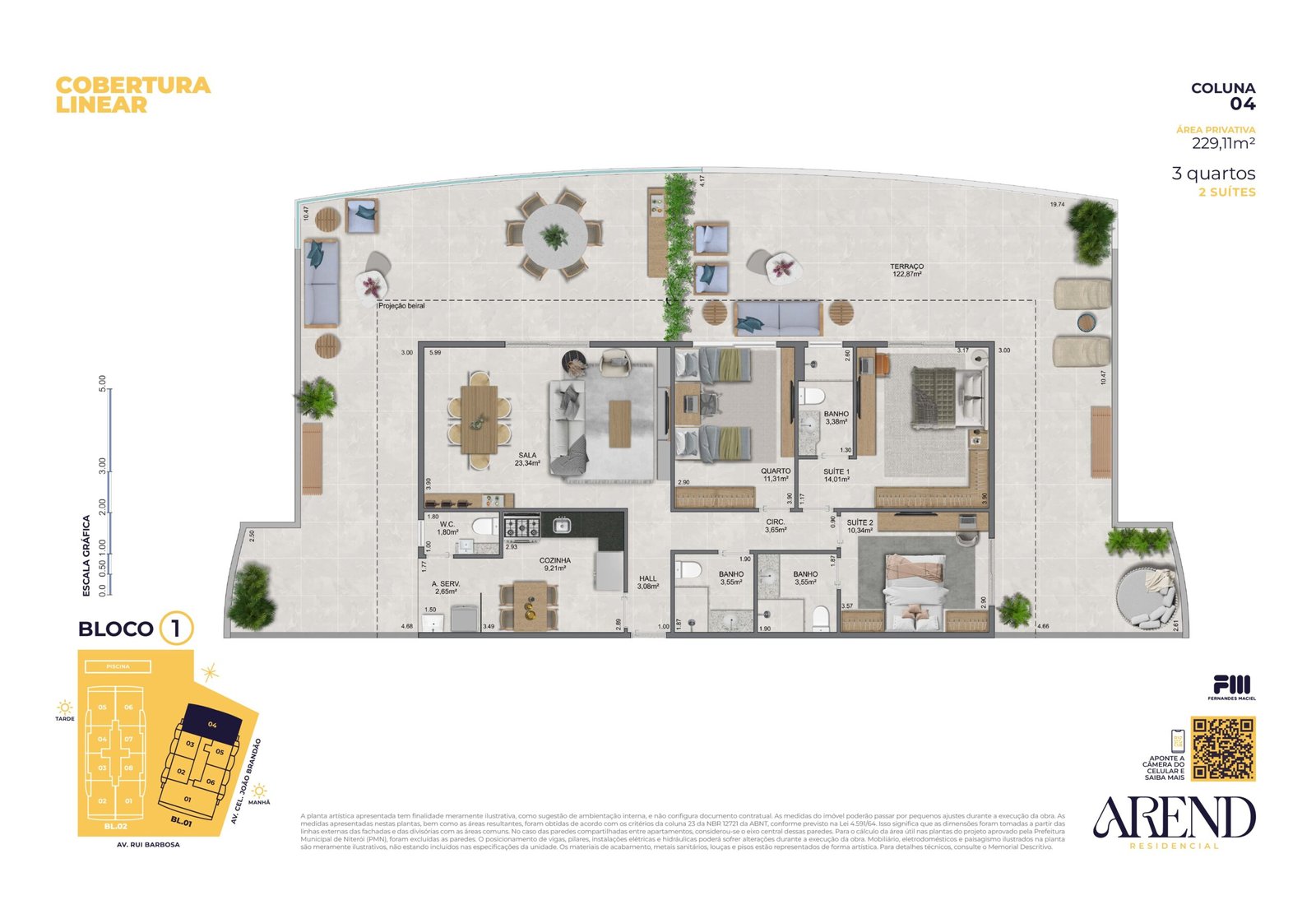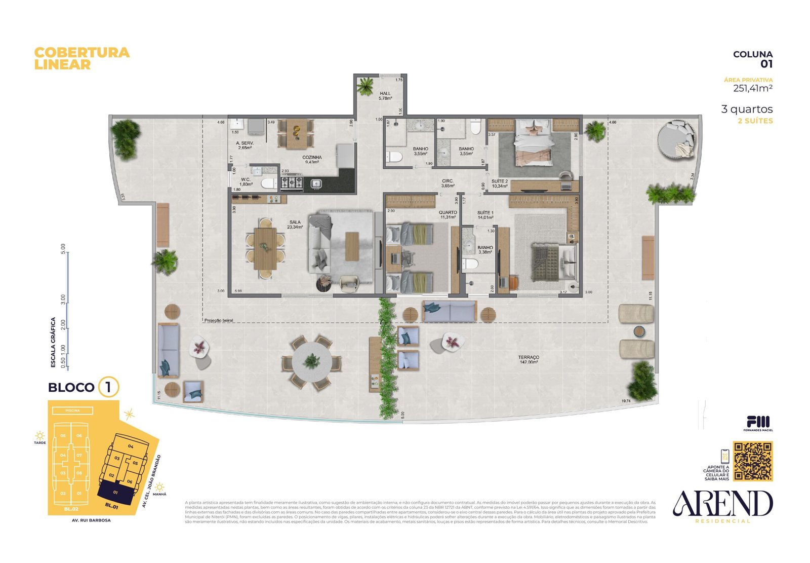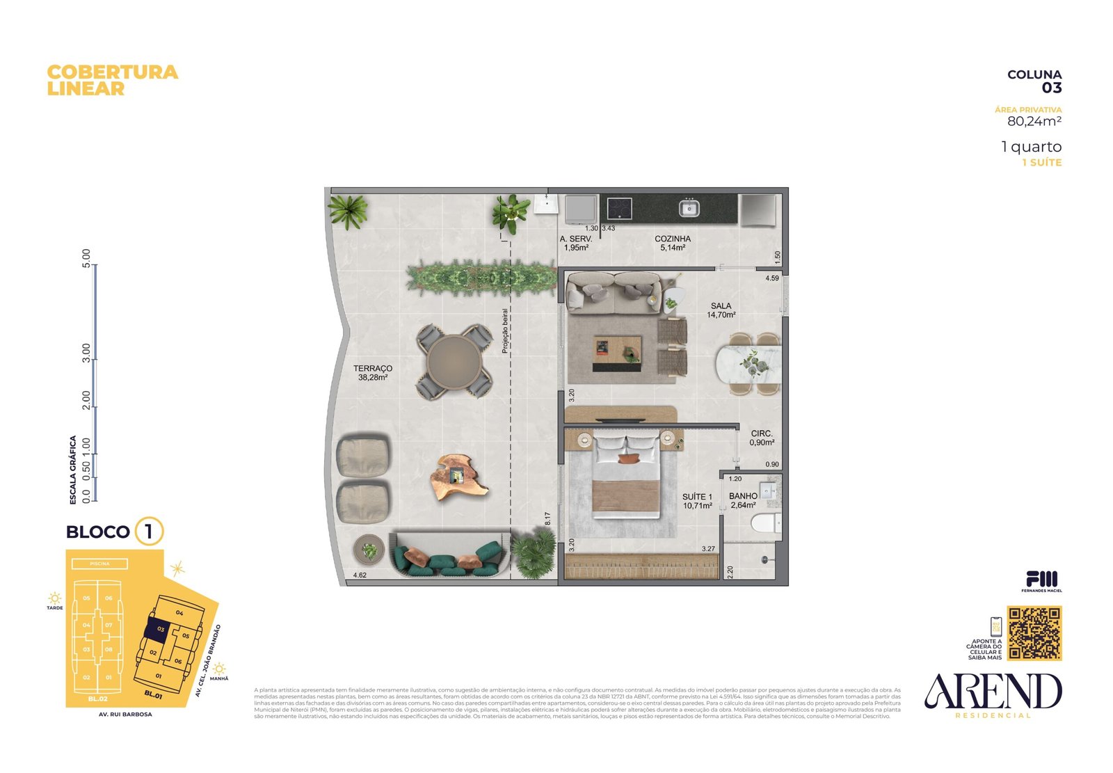 Todas as perspectivas e imagens são meramente ilustrativas podendo sofrer alterações na cor, forma, textura, posicionamento e metragem. A Decoração, iluminação, equipamento e mobiliário das unidades privativas são apenas sugestões, não fazendo parte dos entregáveis, sendo essas meramente enunciativas. A decoração, iluminação, equipamento e mobiliário das áreas comuns, previsto nas perspectivas, poderão ser modificadas, não sendo entregue utensílios, adornos e acessórios eventualmente previsto nas imagens. O paisagismo apresentados nas perspectivas é uma sugestão e apresenta plantas em porte adulto, a ser atingida após a entrega do empreendimento. As informações contidas em todo material publicitário veiculado são meramente ilustrativas, não se configurando como parte de qualquer instrumento legal, podendo, inclusive, ser alterada sem aviso prévio. O empreendimento segue o projeto executivo e às especificações contidas no Memorial de Incorporação, devendo o descrito prevalecer em caso de conflito com qualquer material ou informação. Memorial de Incorporação devidamente registrado na matrícula 25289 no 2º Ofício de Justiça de Niterói. Projeto aprovado pela Prefeitura de Niterói, sob o nº 80/5323/12 em 27/02/2019. Engenheiro responsável: Vicente Paulo Maciel Filho (CREA 85-1-00888 – D/RJ). Autor do projeto: Luiz André Vergara (CAU/RJ: A2616-6). Incorporação e construção: Construtora Fernandes Maciel LTDA (CNPJ 29.761.749/0001-33). Material produzido em Maio de 2025